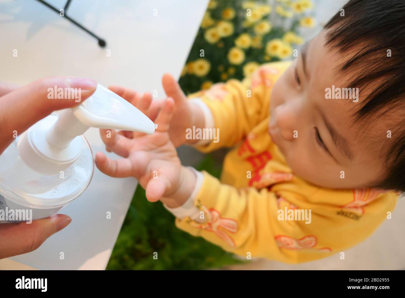 Asian cute baby boy using hand hand sanitizer in baby eye