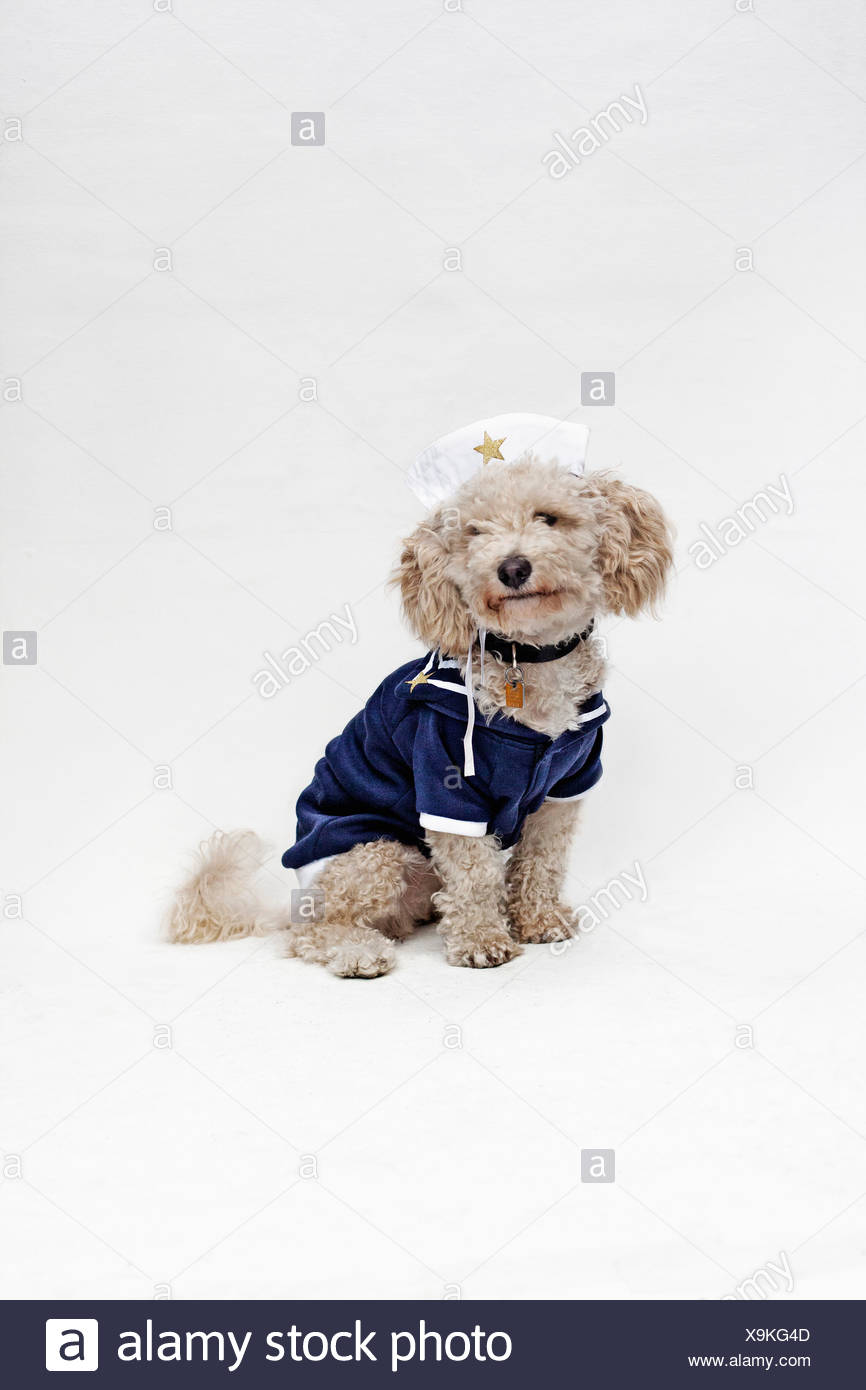 A mixed breed dog wearing a sailor suit dog sailor suit