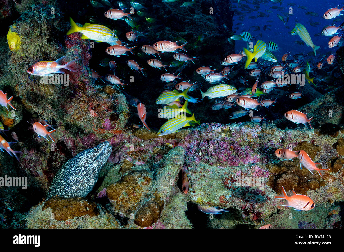 A Moray eel and some tropical fish in some tropical fish