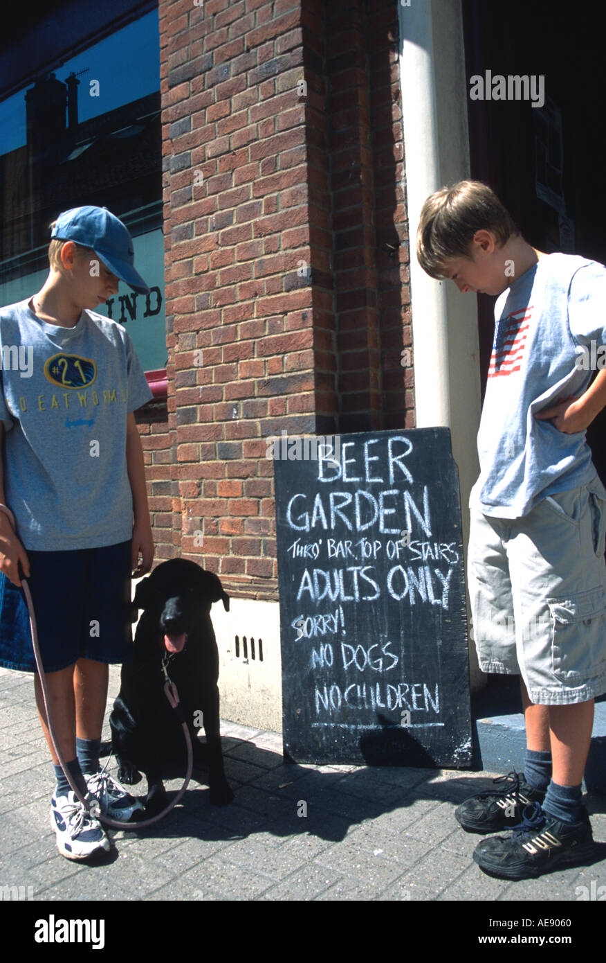 Two boys dog looking at pub sign No no dogs in the house