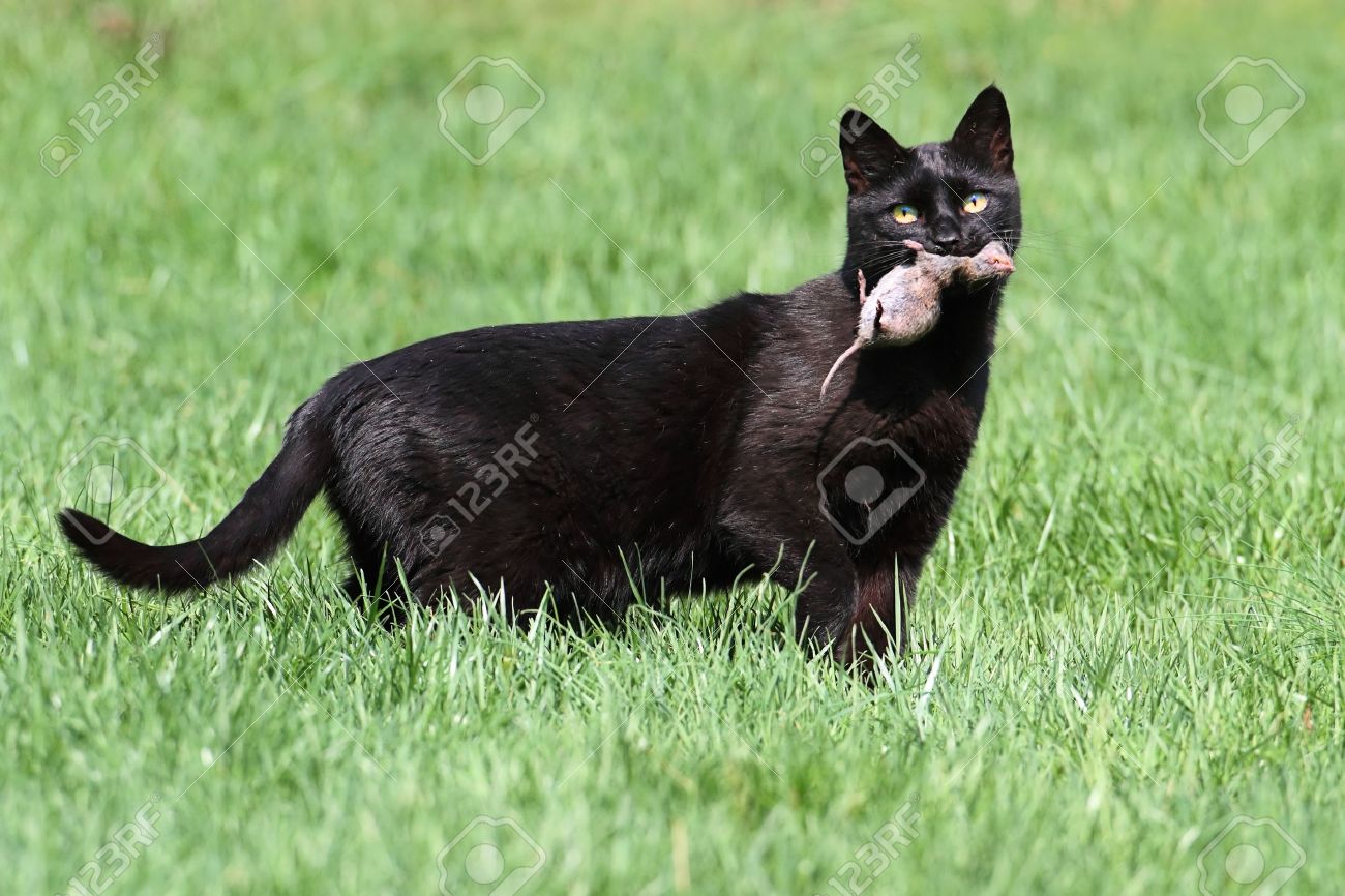 Black Cat With A Dead Mouse In A Field dead black cat