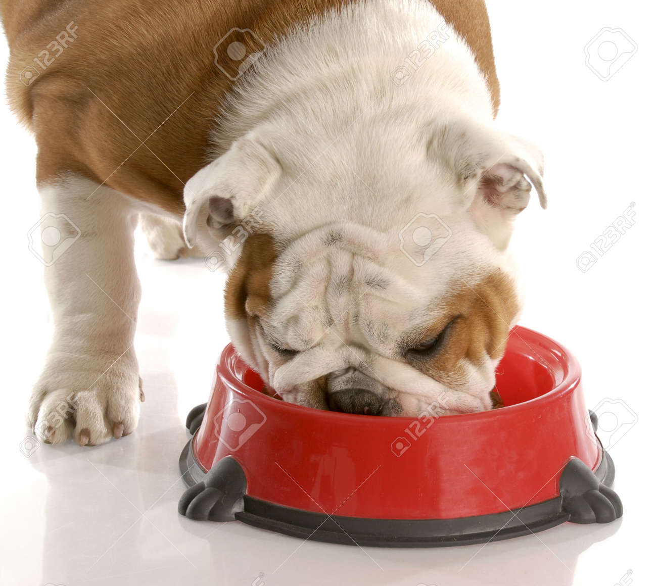 English Bulldog Puppy Eating Out Of Red food for english bulldog