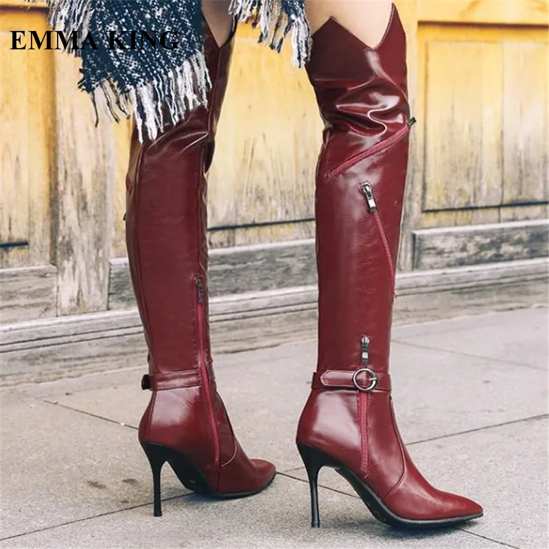 Wine Red Patent Leather Shoes Women belted over the knee boots