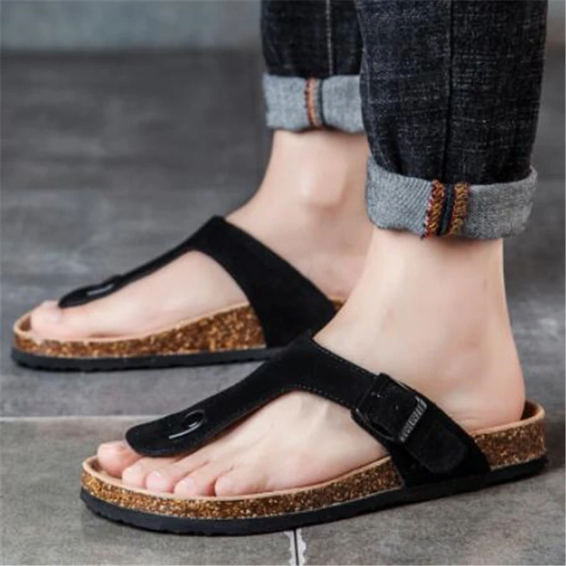 Men's Summer Suede Cow Leather Slippers mens cork flip flops